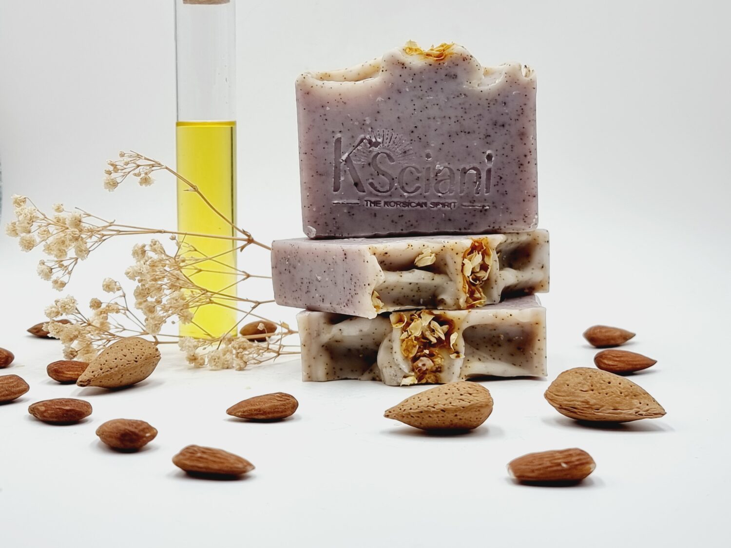 - Huile d’amande douce (ajoutée en surgras) : Elle apporte à notre savon les bienfaits de l’huile d’amande douce, tels que son pouvoir émollient, fortifiant, et tonifiant pour la peau.