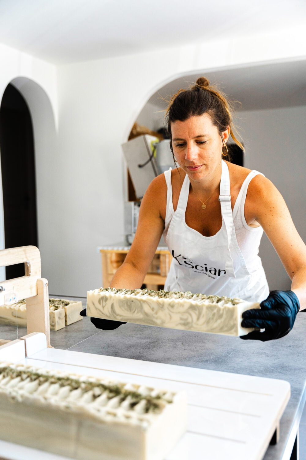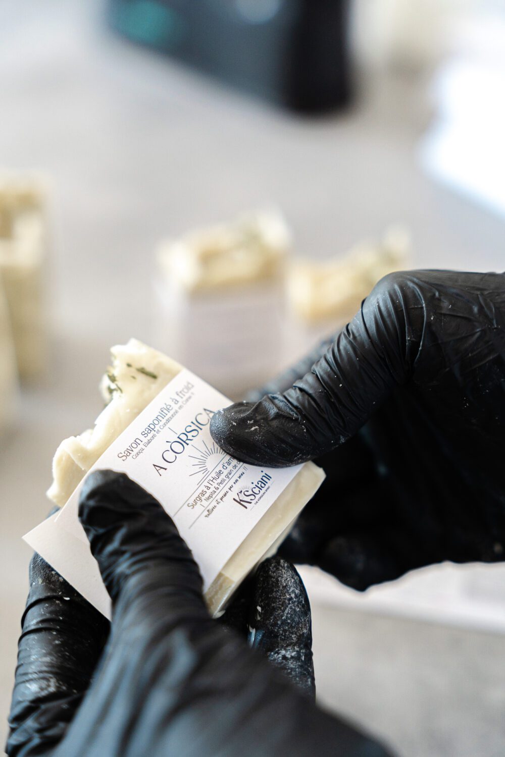 Une fois les blocs démoulés, nous les découpons en barres de savon à l'aide d'un découpeur spécifique, puis en savons individuels de 120g ou 60g. Ces savons sont ensuite laissés à sécher à l'air libre, un processus que les savonniers appellent "cure", qui dure de 4 à 6 semaines. À la fin de cette période, nos savons passent par un contrôle de qualité rigoureux, qui comprend la vérification du pH, de l'odeur, de la couleur et du poids. Une fois approuvés, ils sont étiquetés et prêts à être mis en vente. Chez K'SCIANI, chaque étape de fabrication est réalisée avec soin et précision pour vous offrir des produits d'une qualité exceptionnelle.