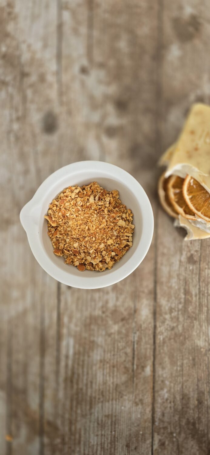 Surgraissé au macérat d’écorces de clémentines, coloré naturellement à la poudre d’écorces et orné d’une rondelle d’orange séchée issue de notre exploitation en Corse.